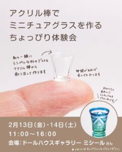 繊細なミニチュア切子作品で人気の高い八戸めぐみ先生の体験会のご案内です。
